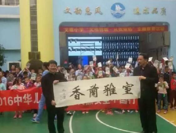 《新魏書法》、《漢字發明書寫經緯十字定位法》的創始人祁繼慶老師為兒童食品安全題寫的“厚德載物”“室雅蘭新”“上善若水”三副新魏體書法作品由兒童食品安全負責人解冰捐贈給了文惠小學和柳州金沙投資管理有限公司。